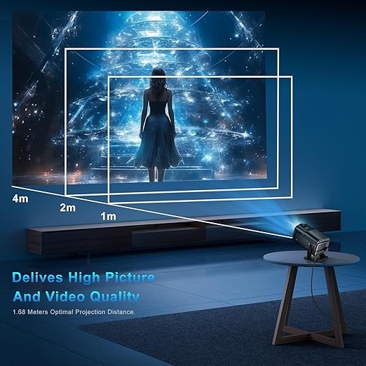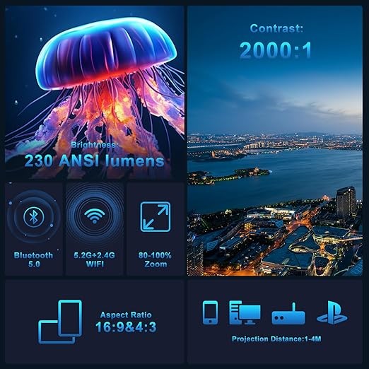 【واي فاي مزدوج 5G/2.4G وبلوتوث 5.2】يدعم جهاز العرض هذا اتصال WiFi بأجهزة Android وiPhone والكمبيوتر اللوحي والكمبيوتر المحمول (Windows 10) للاستمتاع بعروض الأفلام السلسة على شاشة أكبر. يمكن لشريحة بلوتوث 5.2 المدمجة الاتصال بأشرطة الصوت/سماعات الرأس التي تعمل بتقنية البلوتوث وتغمر نفسك في صعود وهبوط ديناميكي ومرتفع. جهاز عرض محمول 4.5*3.7*8.1 بوصة، مثالي للمسرح المنزلي، والتخييم الليلي في الهواء الطلق، والحفلات، وهدايا العطلات، إلخ.