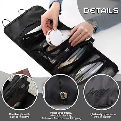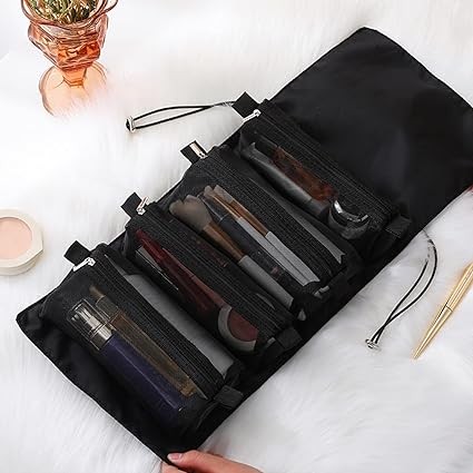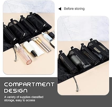 ليس من السهل سقوطها: الجزء السفلي من كل حقيبة شبكية مجهز بأشرطة فيلكرو مما يبقيها في مكانها وليس من السهل سقوطها. توجد أشرطة مرنة قابلة للتعديل على حقيبة مستحضرات التجميل القابلة للطي، والتي يمكن ربط الحقيبة الشبكية بإحكام ويمكن استخدامها أيضًا للتعليق.