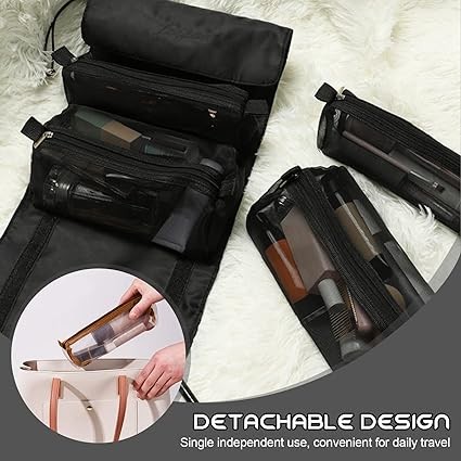 【4 جيوب شبكية قابلة للفصل】 تتكون حقيبة مكياج السفر السوداء من أربع حقائب شبكية داخلية قابلة للفصل وجزء خارجي من النايلون. يمكن استخدامها معًا أو منفصلة وفقًا لاحتياجاتك للحفاظ على مستحضرات التجميل وأدوات النظافة الخاصة بك منظمة.