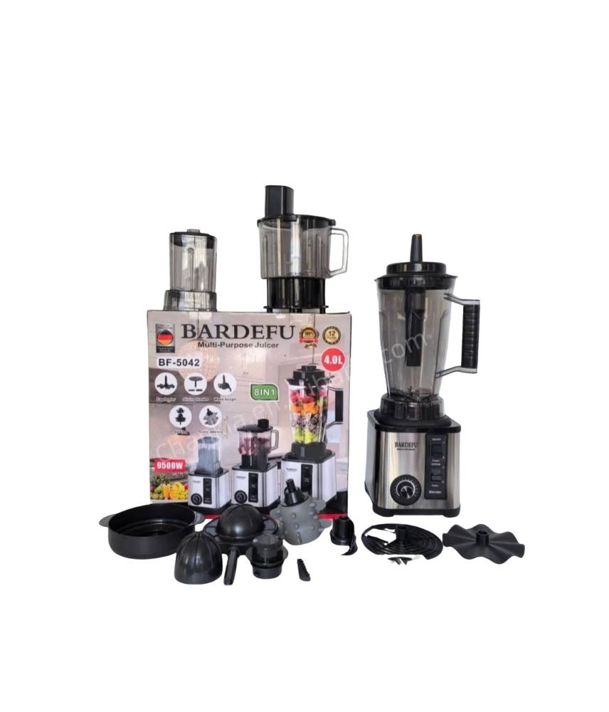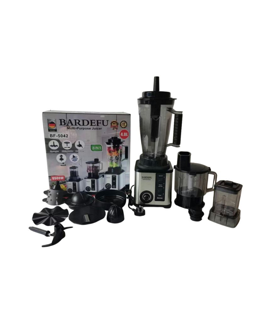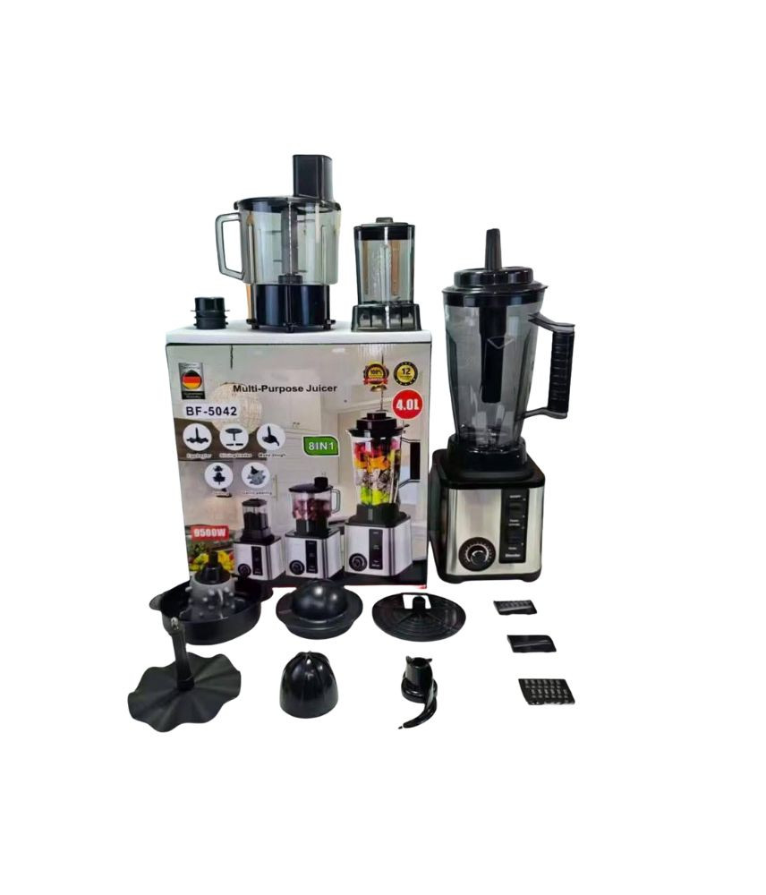 جهاز 8 في 1 يضم خلاط، عصارة، مفرمة، عجان، مطحنة ومجموعة أدوات متعددة.