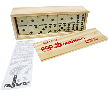 5. **الحجم:** القياسات العامة للصندوق الخشبي هي ارتفاع 2.13 بوصة × عرض 2.5 بوصة × عمق 7.5 بوصة. أما القطع الفردية من الدومينو فهي ذات ارتفاع 2 بوصة × عرض 1 بوصة × عمق 0.38 بوصة.