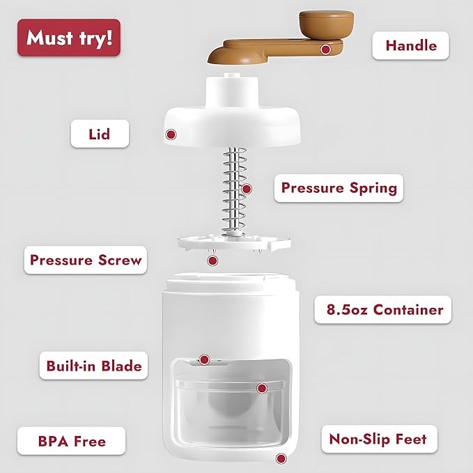 شفرة سميكة - تضمن آلية الزنبرك المدمجة وضعًا آمنًا لمكعبات الثلج على الشفرة، دون الحاجة إلى ضغط، فقط قم بتدويرها، مما يتيح سحق الثلج بسهولة وبدون مجهود.