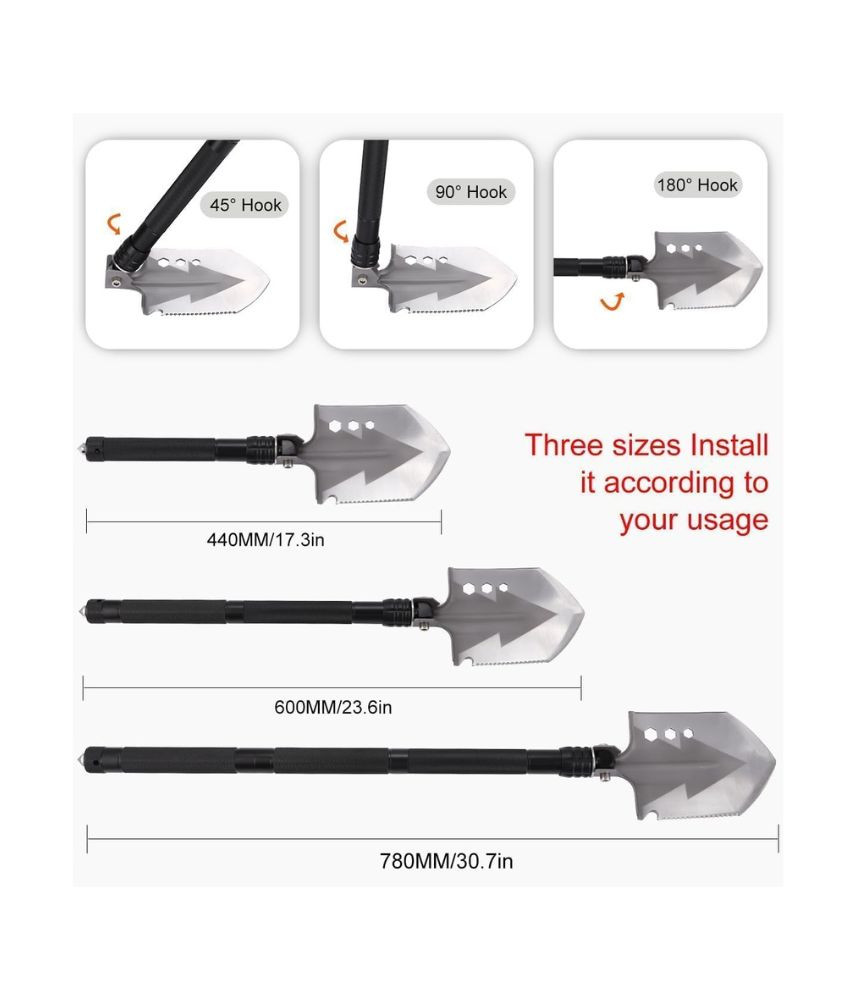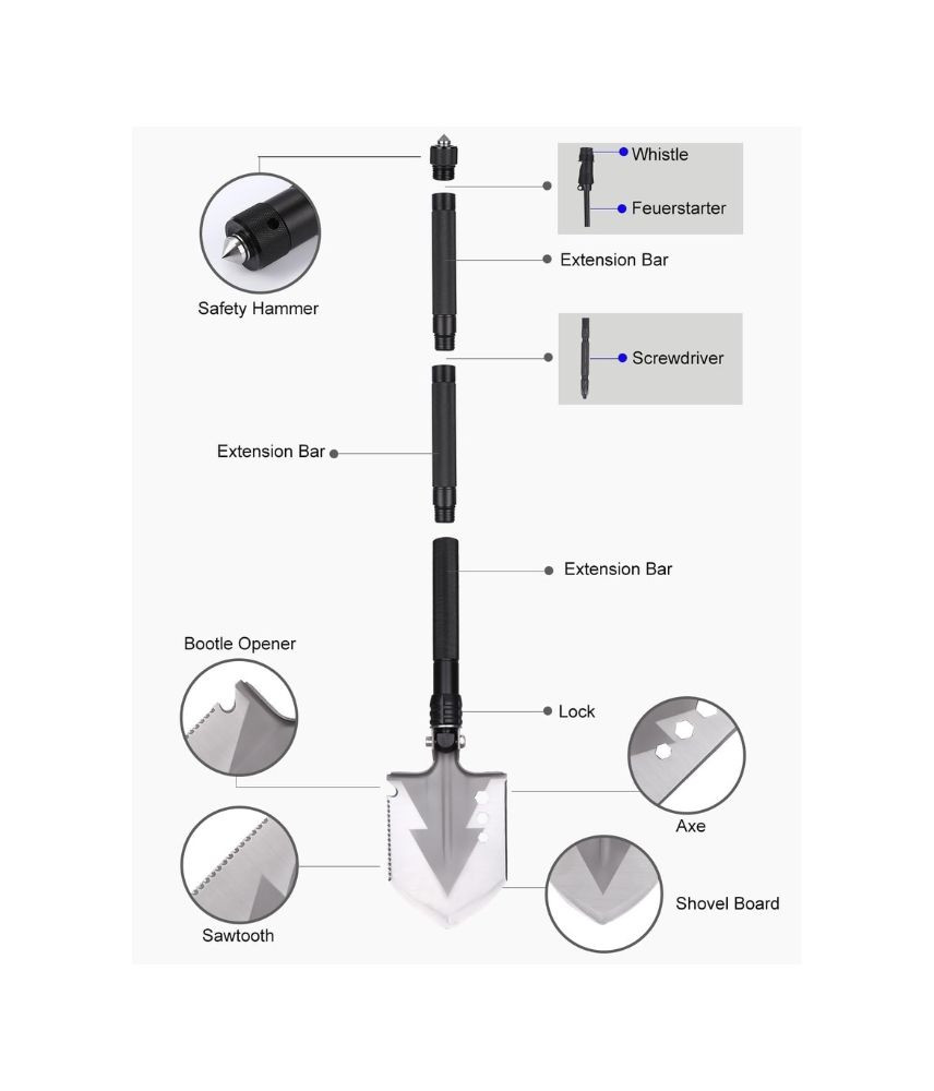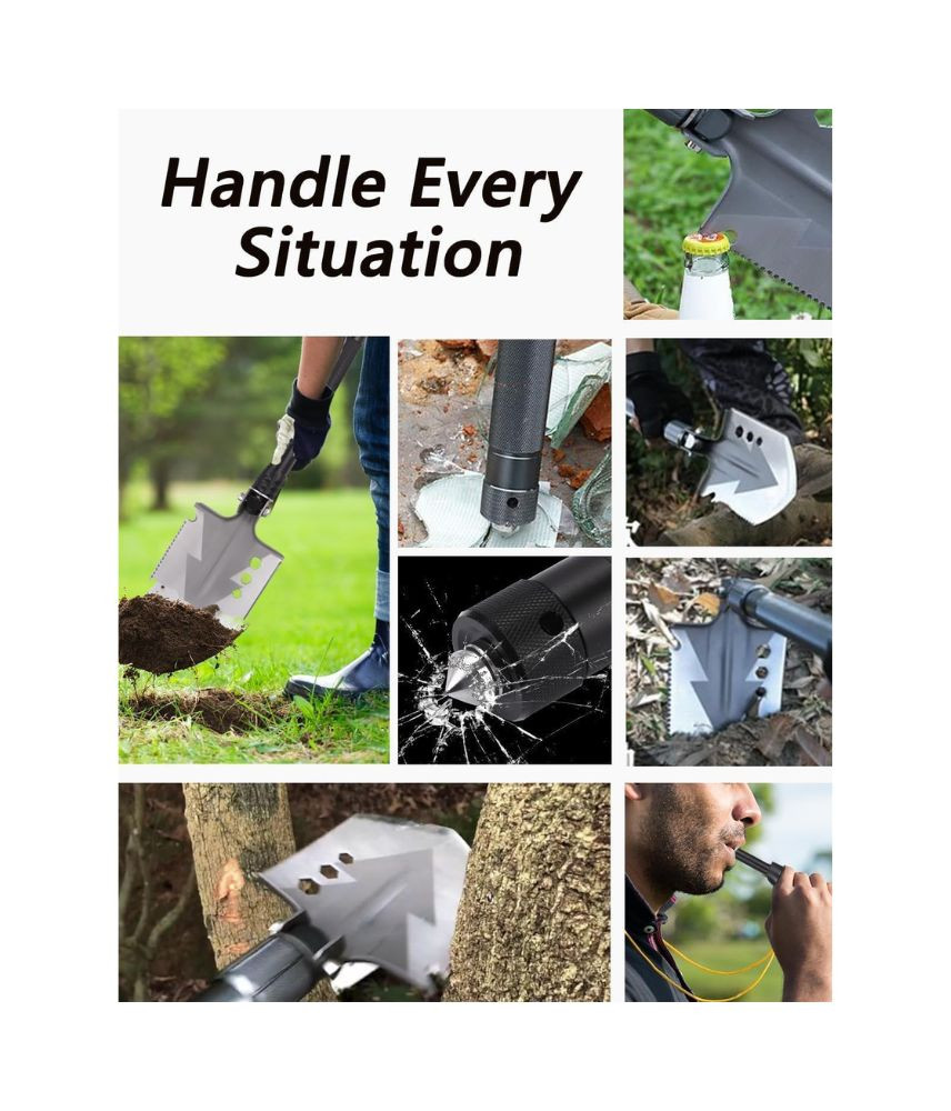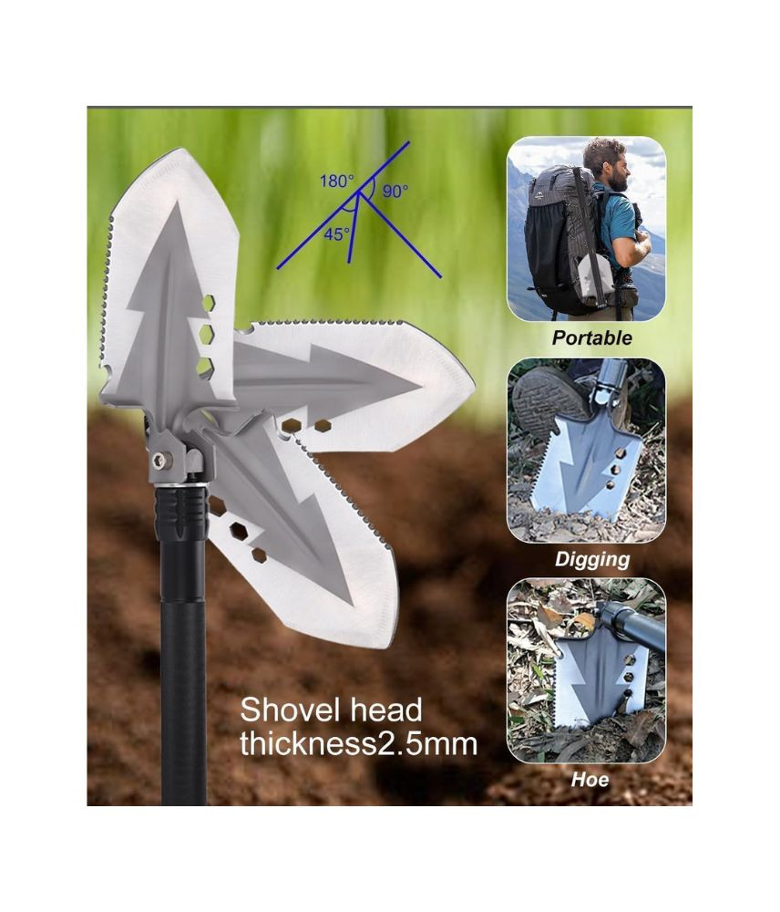 أداة متعددة الاستخدامات تشمل المجرفة، الفأس، السكين، المفتاح، والمطرقة.