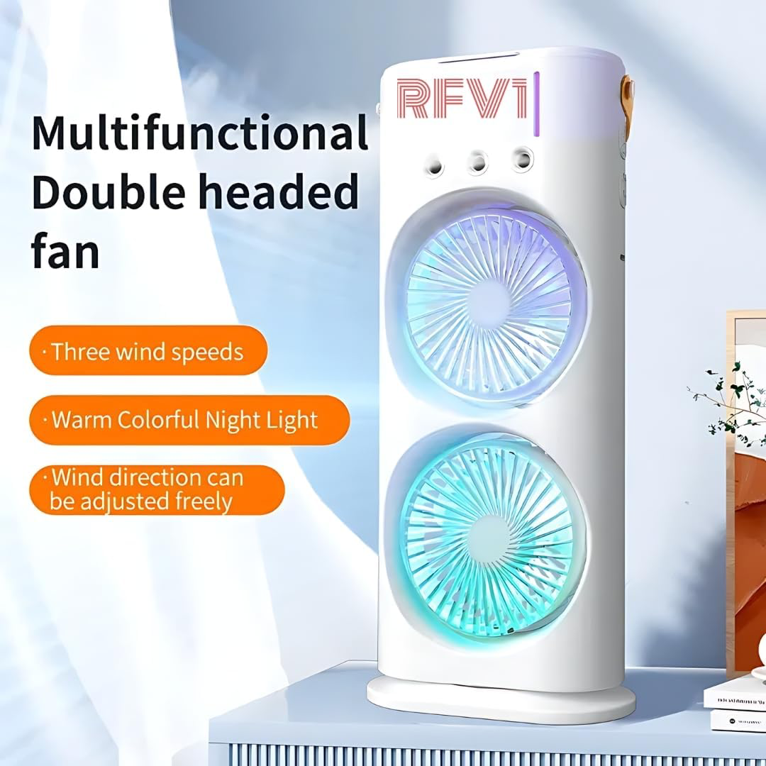 مراوح دوارة مزدوجة - تدور كل مروحة بزاوية 180 درجة حتى تحصل على النسيم المناسب في المكان الذي تريده. محرك BLDC الرقمي - يوجد داخل برج التبريد محرك BLDC الرقمي المتطور الذي يعمل على تشغيل مروحتي تبريد متغيرتي السرعة و3 نفاثات رذاذ تذبذب اختياري 90 درجة - مع تذبذب اختياري 90 درجة، يمكنك الحصول على أقصى تغطية للتبريد شاشة LED مهدئة - تضيف مصابيح LED الجميلة الأناقة والأجواء إلى أي مناسبة من السهل - فقط أضف الماء - إنه أمر سهل للغاية - فقط أضف الماء، بضغطة واحدة فقط تحصل على نسيم رذاذ دقيق مزدوج متأرجح قابلة لإعادة الشحن عبر USB - حتى تتمكن من الاستمتاع بها في كل مكان وفي أي مكان