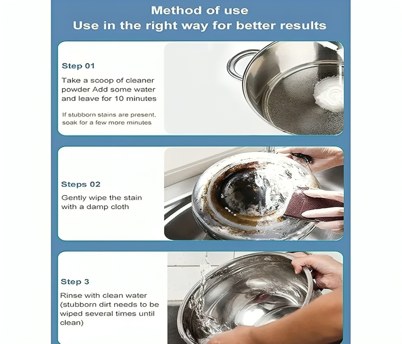 : مناسب لأطباق البورسلين، البلاط، الفولاذ المقاوم للصدأ، الزجاج، مواقد الغاز، والأدوات المصفرّة لإعادتها إلى لونها الأصلي.