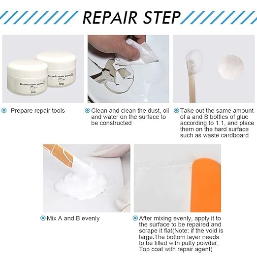 طقم إصلاح حوض السيراميك: يجعل من السهل إصلاح البلاط المكسور. يمكن لمجموعة إصلاح السيراميك الخاصة بنا تغطية الشقوق وملء الثقوب وإجراء الإصلاحات بسهولة، مما يمكنه استعادة المظهر الأصلي.